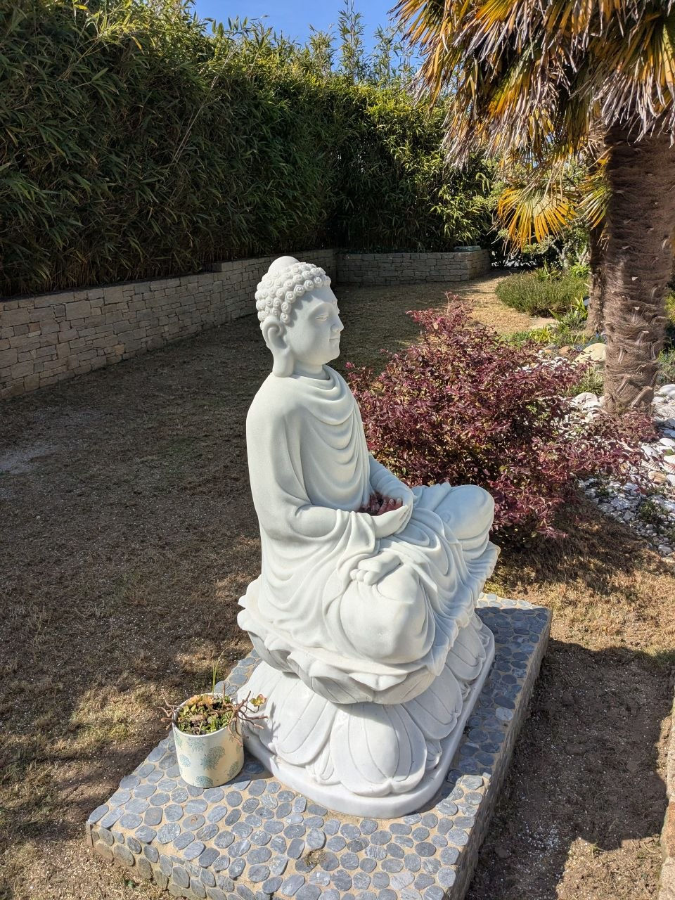 Mais ce jardin ne se résume pas à sa pelouse. Ce qui le rend véritablement unique, c’est l’ambiance qui s’en dégage. À proximité de la piscine, une statue attire immédiatement le regard. Assise en position de méditation, elle dégage une impression de calme et de sérénité. Son blanc lumineux contraste avec les teintes naturelles du jardin : le vert profond des haies, les nuances rouges des arbustes et les tons plus secs du sol en cours de régénération.